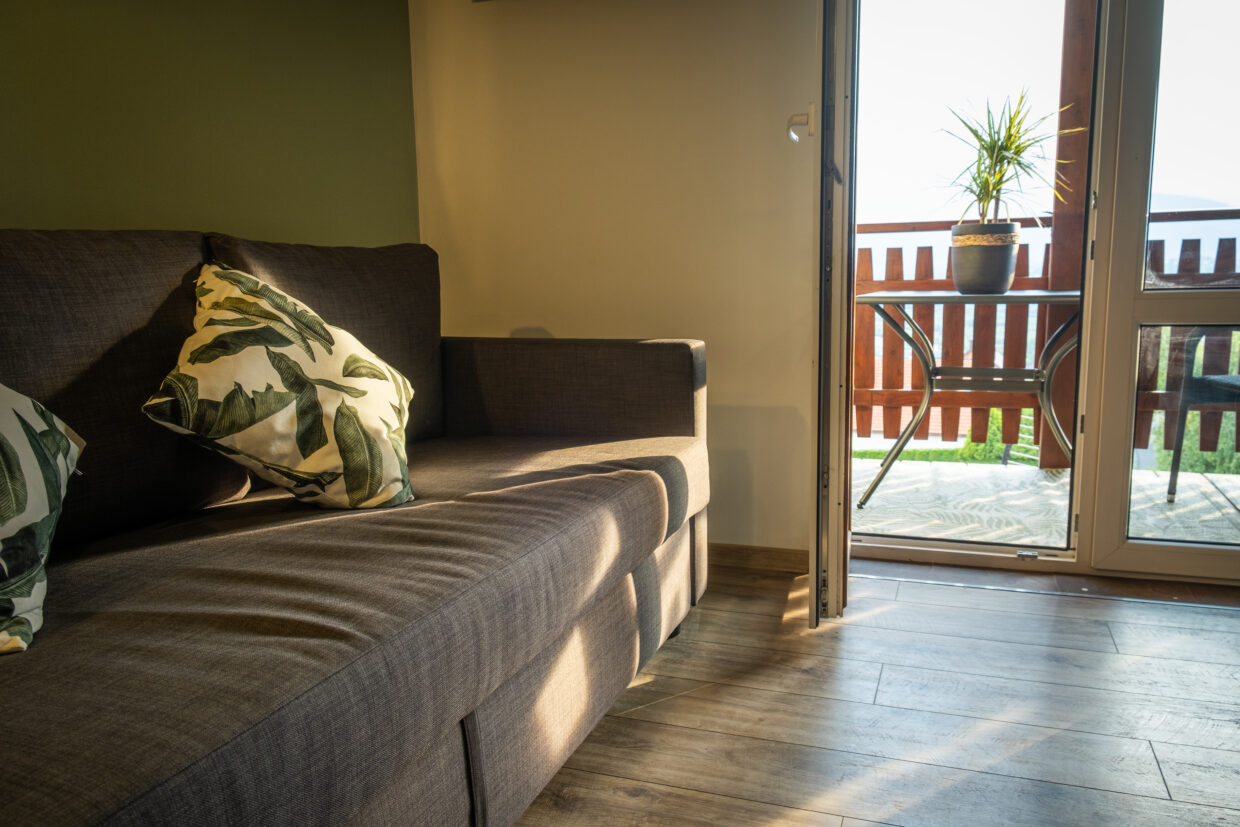 To idealny pokój dla całej rodziny lub 4 osób. Jest on zrobiony w stylu rustykalnym. Największym atutem tego pokoju jest prywatny taras, z którego są przepiękne widoki na Żywiec oraz pobliskie góry. Nawet z pokojowego łóżka widać panoramę na Beskid Żywiecki. Pokój znajduje się na drugim piętrze naszego zajazdu. W pokoju znajdują się dwa łóżka dwuosobowe. W tym apartamencie mają Państwo również wyposażoną kuchnię. Pokój ten posiada jeden z najładniejszych widoków z wszystkich pokoi. Pokój ten jest mniejszy niż Suite Mięta o 15m2. Ma on około 23m2.